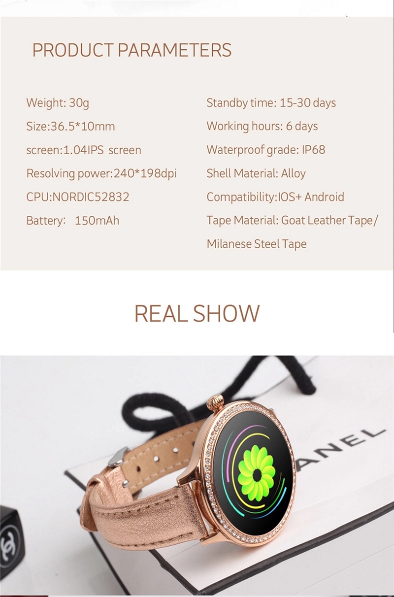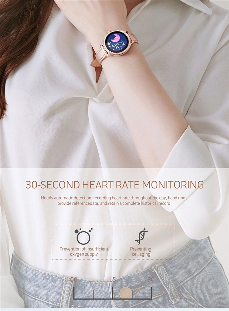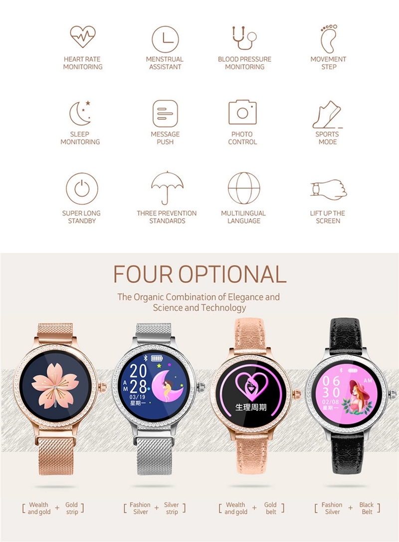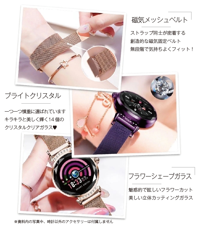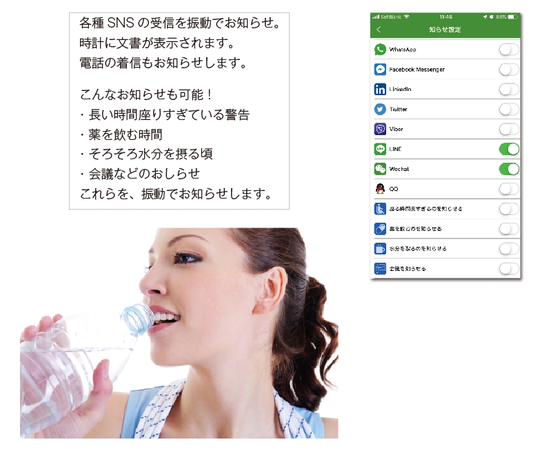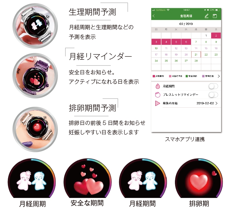 | その他 | 女性の生理周期のインテリジェント予測 (生理周期、安全日、排卵日、生理期間等を表示) 輝度調整、テーマ選択、電話着信のチェック アラーム(目覚まし時計/薬/会議/着座時間/飲料水の催促) 1つの健康対策心拍数、血圧 リモートカメラ(手を振ることでスマートフォン本体で撮影) 相対移動、測定データの確認 |