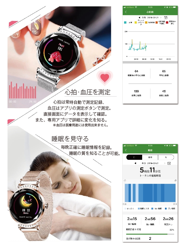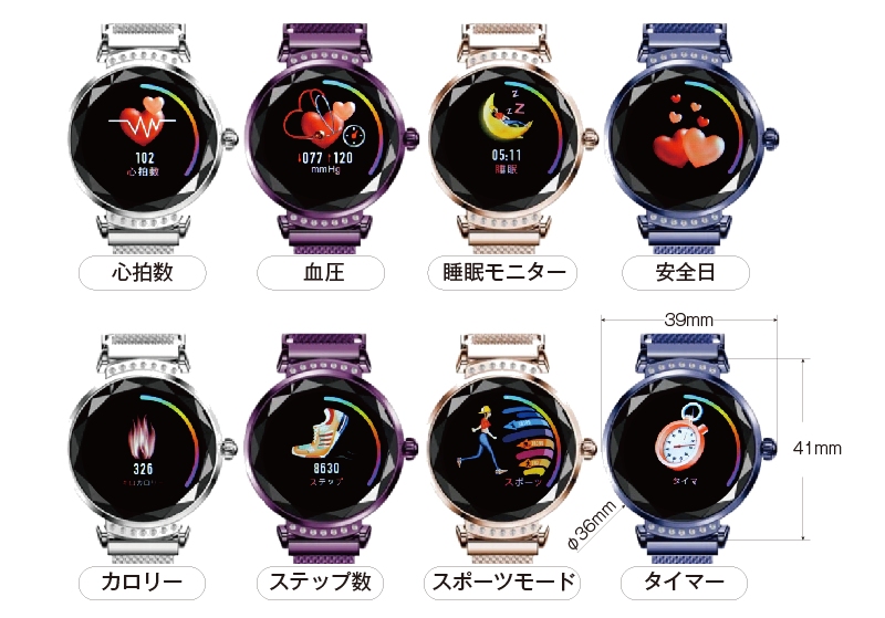| 主な機能 | 時間/時計表示、ステップカウント、カロリー、距離、睡眠、オン/オフを表示、24 時間連続心拍数監視、血圧測定 |