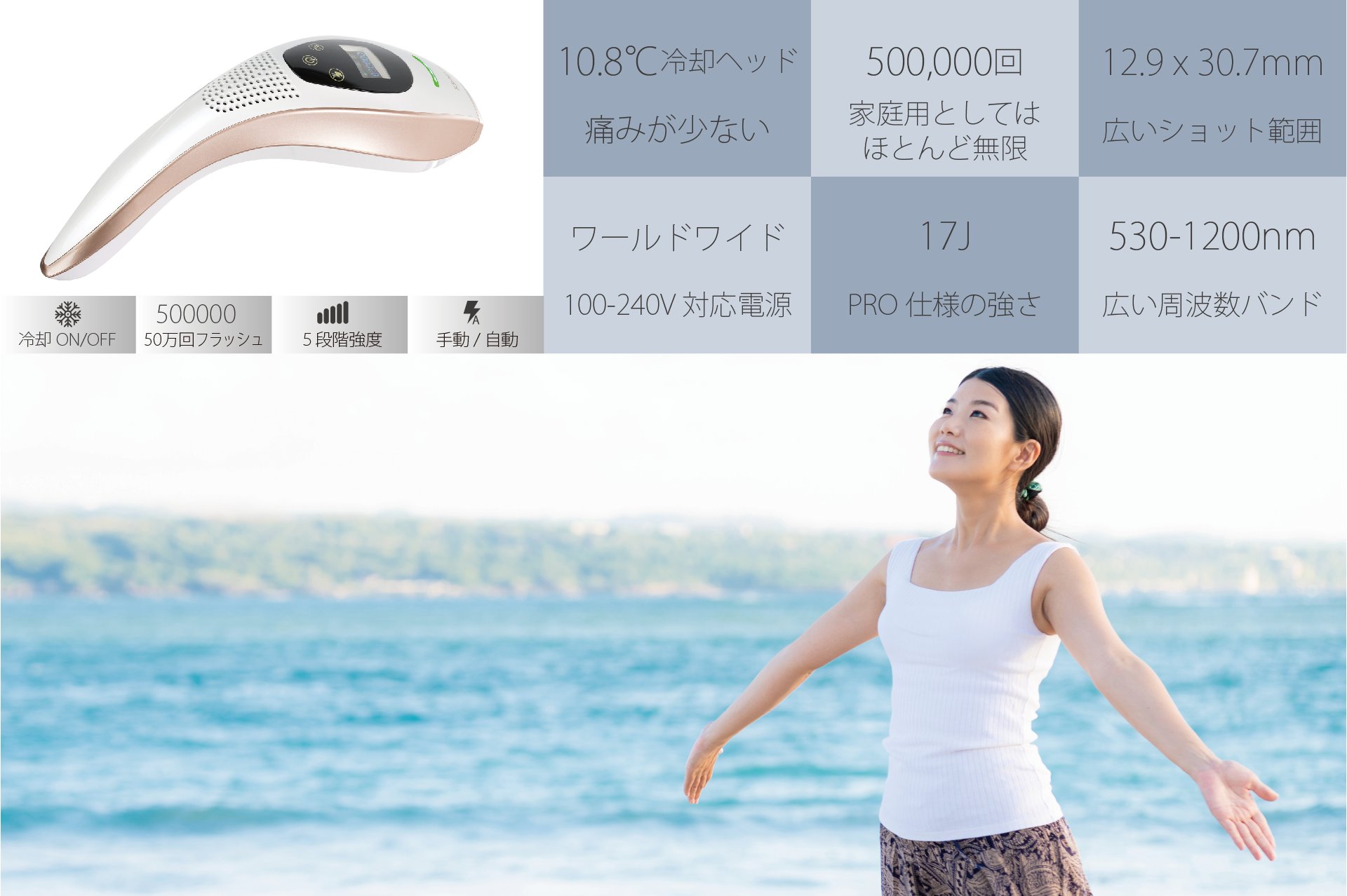 | 脱毛方式 | IPL方式(インテンス・パルス・ライト方式) クォーツセル(石英セル)使用 |