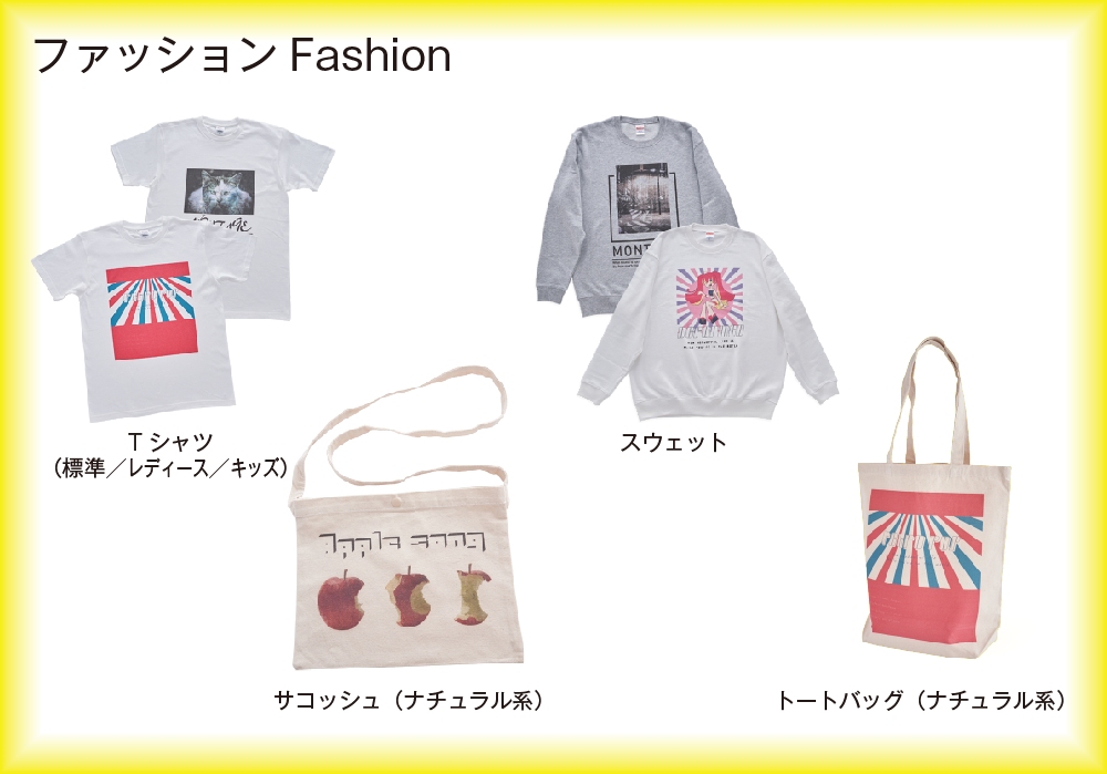 素材:綿/5.6oz前後 S/M/L/XL、WM/WL、100cm~160cm、白地・黒地・そのほかカラー各種