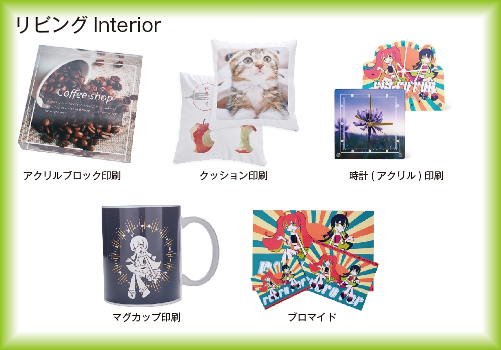 アクリルに写真やイラストを印刷してアクリルの奥行きを活かすことで、透明感のあるインテリア雑貨ができあがります。